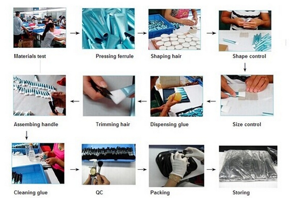 - The bristles are glued into the ferrule, and then the ferrule is attached to the handle using strong adhesive, branding logo is added on the handle.